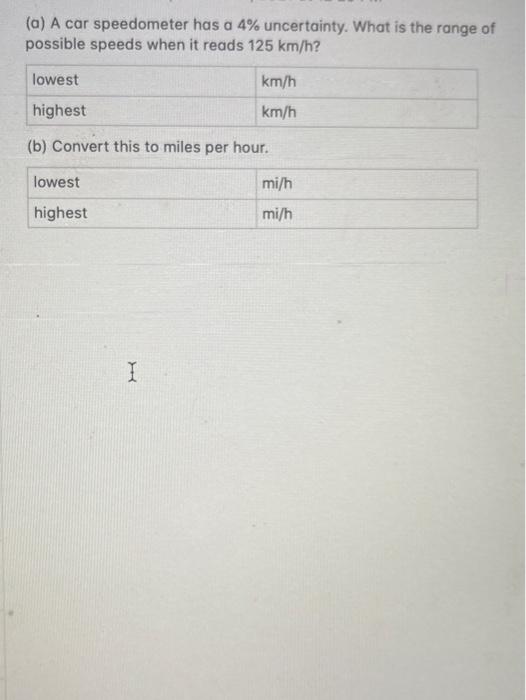 1.13 A car speedometer has a 5.0 uncertainty. What is the range of A Car Speedometer Has A 8 Uncertainty A) a car speedometer has a 5.0% uncertainty. (a) a car speedometer has a 5.0% uncertainty. What is the range of possible speeds when it. For each answer, enter a number.) lowest. What is the range of possible speeds (in km/h) when it reads 50 km/h? (a) a car speedometer has a 8% uncertainty. What is the range of. A Car Speedometer Has A 8 Uncertainty.
